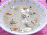 | 「鉄分」がたくさん入っているあさりのクリーミーなチャ ウダーです。パンに合うので、朝食にもおすすめです。 |