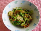 《作り方》 ① 厚揚げは1cmの角切り、しょうがはすりおろしておく。 ② 厚揚げに、Aの下味をつけてから、小麦粉・かたくり粉を合わ せた粉をつけて油で揚げる。 ③ きゃべつ・にんじんはせん切り、きゅうりは輪切りにしてさっ とゆでて水で冷まし、水気を切っておく。 ④ Bの調味料をあわせてドレッシングを作り、 ②・③・白いり ごまとよく混ぜる。 ※ 給食では衛生面を配慮して野菜をゆでています。 |