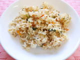《作り方》 ① 米は、酒・しょうゆを加えた水分量で炊く。 ② 塩メンマは塩抜きして、細かく切る。焼き豆腐は水きり し、くずしてから炒りする。 ③ にんじんはせん切りにしてゆでる。 ④ ほうれん草・もやしはゆでて2~3cmに切る。 ⑤ AとBの長ねぎをみじん切りにし、しょうが・にんにく はすりおろす。 ⑥ Bを合わせ、加熱し冷ましておく。この調味料に、にん じん・ほうれん草・もやしを混ぜ、つけておく。 ⑦ 油を熱し、トウバンジャンを炒め、Aの長ねぎ・しょう が・にんにく・豚肉を加えてよく炒める。さらに②を加え て全体がぽろぽろになるまでよく炒め、Aの調味料を加え て味をととのえる。 ⑧ 炊き上がったごはんに汁をきった⑥と⑦と白いりごまを 混ぜる。 ★ 給食では、胚芽米と米粒麦を使用しています。★ 不足しがちな食物せんいとビタミンB1を補うために、 胚芽米に麦を混ぜて使っています。 |