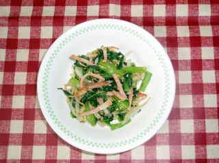 | 「カルシウム」と「鉄」がたっぷりな小松菜とカリカリの ベーコンを合わせた和風のサラダです。とても簡単にできま すので、ぜひ作ってみてください。 |