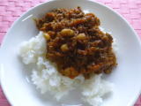 《作り方》 ① 野菜はみじん切りにする。レーズンは水でもどしてみじ ん切りにする。 ② 小麦粉とカレー粉はフライパンでから炒りしておく。 ③ 油を熱して、しょうが・にんにく・セロリを炒め、ひき 肉を入れてぽろぽろになるまで炒め、たまねぎを加えよ く炒める。にんじん・白いんげん豆水煮・水も加える。 ④ ③に②をふり入れ炒め、レーズン・Aを入れ、汁気をと ばす。 ⑤ パセリ、赤ワインを加え、できあがり。 ※ 給食では白いんげん豆を使用していますが、ほかの豆 でも作ることができます。 |