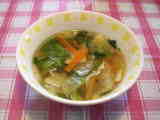 名前のとおり、野菜がいっぱい入った色あざやかなスー プです。レタスは、生で食べるよりも、火を通すことでた くさん食べられます。 |