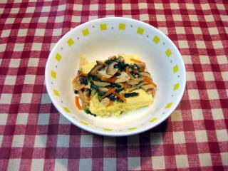 《作り方》 ① だしをとり、(1)の分は冷ましておく。 ② つとは、半月切り。たけのこ・にんじんは、せん切り。 干ししいたけは、もどしてせん切り。ほうれん草は、ゆ でて1cmくらいに切る。 ③ 卵を溶いたものをこして、①の冷ましただし汁・豆乳・ Aの調味料と混ぜ、器に流して蒸す。 ④ だし汁(2)に、ひき肉を入れほぐしてから、②のしい たけ・たけのこ・にんじん・つとを入れて煮て、Bで味 をととのえる。水で溶いたかたくり粉でとろみをつけ、 ほうれん草を入れて、蒸し上がった卵豆腐にかける。 ※ 卵を蒸す時は、最初強火で蒸し、ふたのふちから蒸気が 出始めたら弱火にして15分くらい蒸すと、きれいに蒸 し上がります。(蒸し時間は、流し入れる容器・火加減 などによって変わりますので、ご家庭で調節してくださ い)。 ※ 給食では、けずりぶしと昆布でだしをとっています。 |