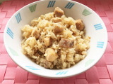 《作り方》 ① 鶏肉は、すりおろしたしょうが・酒につけておく。 ② たまねぎは1cmの角切りにする。 ③ 鍋に油を熱し、鶏肉をよく炒める。さらにたまねぎを入 れて炒め、Bの調味料で味をととのえる。 ④ ③をざるにあけ、汁と具にわけておく。 ⑤ スープ(水)にAの調味料と④の煮汁を加え米を炊く。 ⑥ 炊き上がったご飯に④の具を混ぜる。 ★ 給食では、胚芽米と米粒麦を使用しています。★ 不足しがちな食物せんいとビタミンB1を補うために、 胚芽米に麦を混ぜて使っています。 ※ 給食では鶏がらなどのスープを使用しています。 |